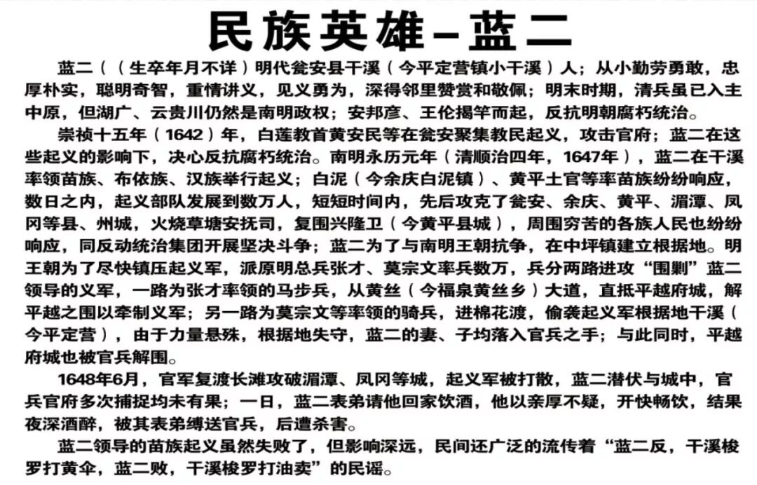 藍(lán)二領(lǐng)導(dǎo)的苗族起義雖然失敗了,但影響深遠(yuǎn),民間還廣泛的流傳著“藍(lán)二反,干溪梭羅打黃傘,藍(lán)二敗,干溪梭羅打油賣”的民謠。
